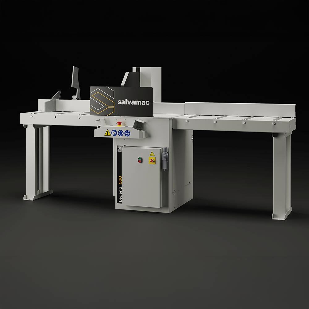 The Salvamac Legend 500 chop saw features a thick, reinforced painted steel structure and a 500 mm diameter blade powered by a 5.5 kW motor at 2800 rpm, making it ideal for cutting wood up to 125 mm thick and 310 mm wide, or optionally up to 375 mm. Its solid ground anchoring system with flanged steel feet ensures maximum stability, while the ergonomically positioned bimanual safety controls allow safe and comfortable operation. Cutting speed is adjustable via a pneumatic regulator, and the electro-pneumatic presser securely locks the workpiece during cutting. The presser movement runs on ball bearings with double dust protection and automatic lubrication for smooth, reliable operation. Both the machine and its electrical system are fully compliant with CE standards.