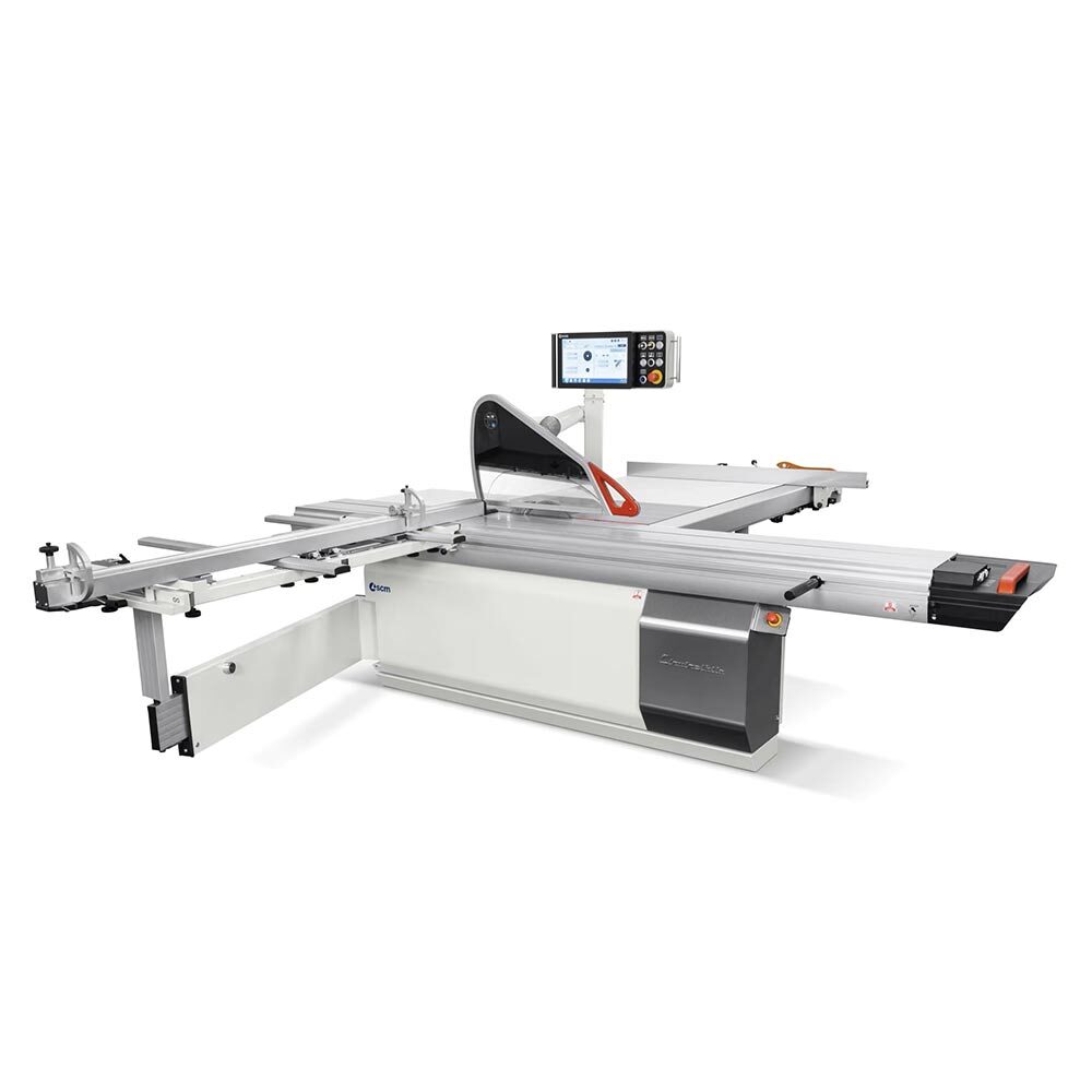 The SCM L’invincibile SI 3 sliding table saw offers seamless connectivity through its “eye‑S” console, enabling integration among machines on the same company network, 4.0 Industry preset compatibility, sharing of work programs and tools database, activity monitoring, and connectivity with SCM Thundercut for optimization and sequencing, along with self-diagnosis and tele-service functions. Its programmed rip fence moves on a recirculating ball screw mechanism with linear guide sliding for quick, precise positioning and can be easily excluded from the working area when not in use. The sliding carriage guarantees maximum cut quality over time, requiring no adjustment and featuring SCM’s exclusive arch-ground steel slideways that can bear loads four times higher. The mobile “eye‑S” control panel combines a 15” colour touchscreen with the Maestro active user interface for intuitive machine programming. A telescopic swinging arm ensures fluid movement, with the squaring frame supported by a large-dimensioned extrusion sliding on prismatic linear guides with recirculating ball bearings.