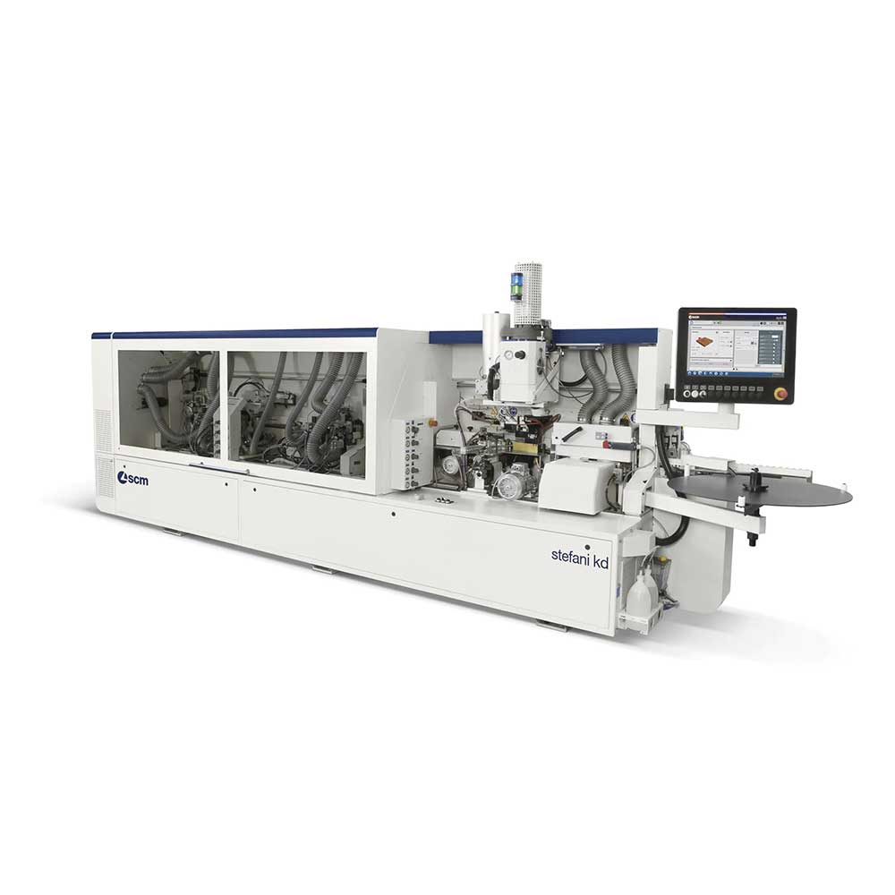 The SCM Sefani KD is all you would expect from an edge banding machine for companies producing both small and large batch runs. It offers full capability with EVA and PUR glues through its advanced SGP glue pot and seamless handling of thin edges and solid wood up to 12 mm. Its fully automatic multiedge units with electronic axes allow rapid, error-free setup for two different radii, making it ideal for varied production needs. Operators benefit from easy access to the gluing zone for processing large solid-wood edges, while the optimized spreading roller and precise glue dosing ensure a consistently perfect glue line. The Sefani KD also delivers flawless results on delicate or film-protected panels thanks to its innovative polyurethane pressure belt, ensuring high-quality edge application across a wide range of materials.